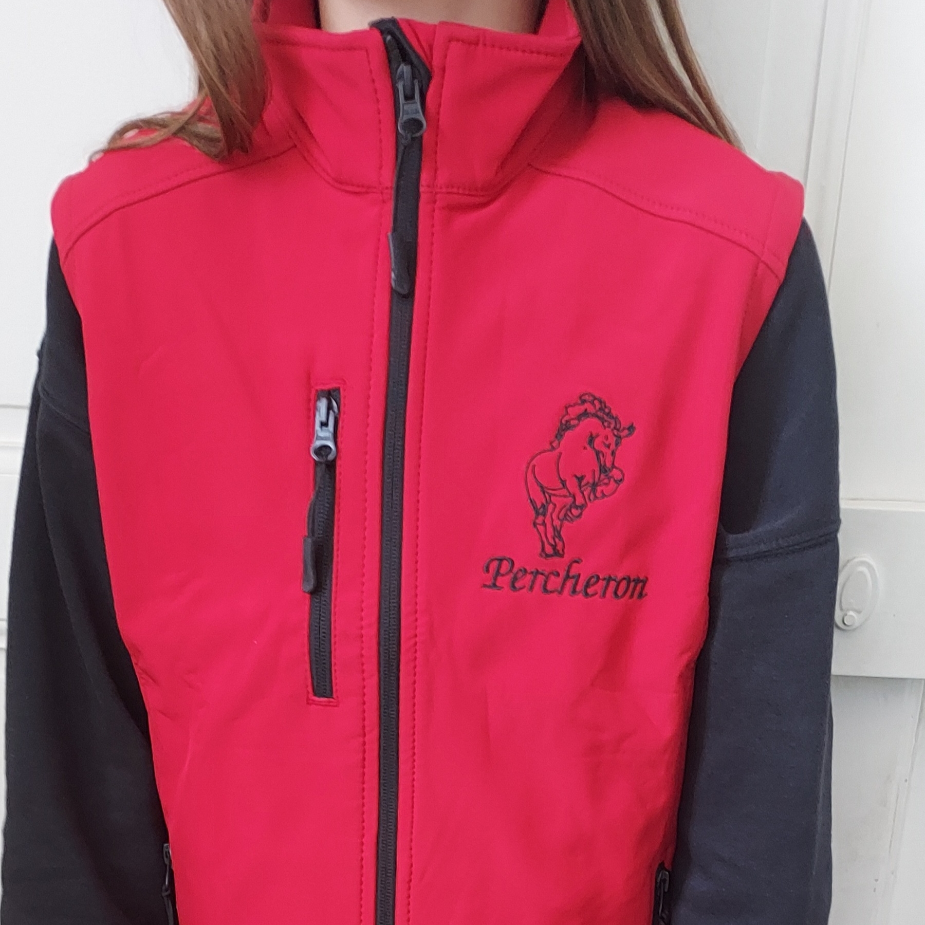 Veste couleur rouge sans manches. Broderie noire coeur Cheval Percheron.